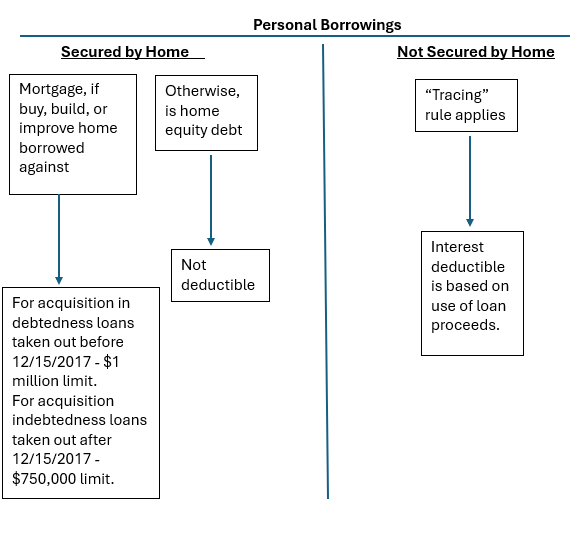 Example 3. Francine purchased a home (principal; residence) for $250,000 in 2016 and borrowed $200,000 as qualified acquisition debt. In 2025, when the remaining balance due was $40,000, Francine refinanced with a new $200,000 mortgage. Acquisition debt is now only $40,000; home equity debt is $100,000 and personal debt is $60,000. This is assuming that the refinancing proceeds were used for improvements. Note that none of the interest paid on the $60,000 personal debt is deductible unless the entire proceeds are used for capital improvements to the home – such as renovating a kitchen and/or bathroom or building  onto the home.