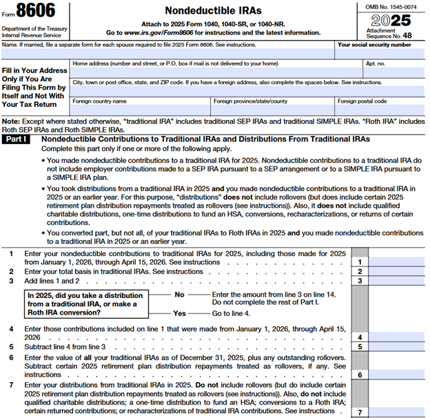 Step 4 Roth IRA owner who recharacterizes a 2025 Roth IRA contribution to a traditional (nondeductible) IRA needs to report the amount of the contribution being transferred to the traditional IRA on IRS Form 8606 – Part I (Nondeductible IRAs). A copy of IRS Form 8606 Part I Line 1 for the year 2025 is shown here:
