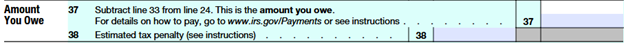 These late-tax payment penalties are for underpayments of estimated tax. The estimated tax penalty appears on line 38 of 2025 IRS Form 1040, as shown here: